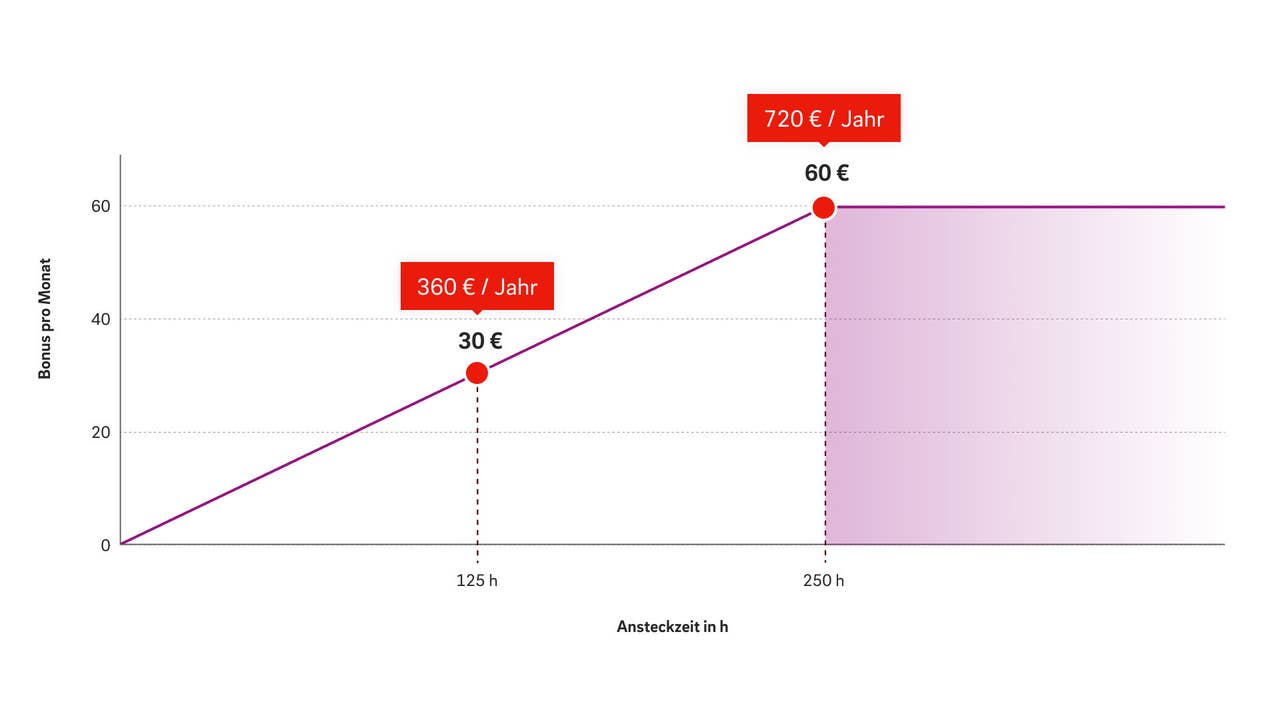 Voraussetzung für den Bonus sind die genannten Produkte und sofern das Elektrofahrzeug an die Wallbox angesteckt sowie die V2G-Funktion aktiviert ist, übernimmt ein von BMW und E.ON entwickelter Algorithmus das automatische Laden und Entladen. Für jede Stunde „Ansteckzeit“ wird ein Bonus von 24 Cent pro Stunde bis maximal 60 Euro im Monat gewährt – bei 250 Stunden. Damit profitiert man von einem E.ON-Bonus von bis zu 720 Euro pro Jahr und Fahrer können so bis 14.000 Kilometer pro Jahr kostenlos zurücklegen, so BMW. Die monatliche Ansteckzeit ist nicht vorgeschrieben und kann auch geringer ausfallen, wie die folgende Grafik zum V2G-Bonus von E.ON zeigt:
