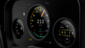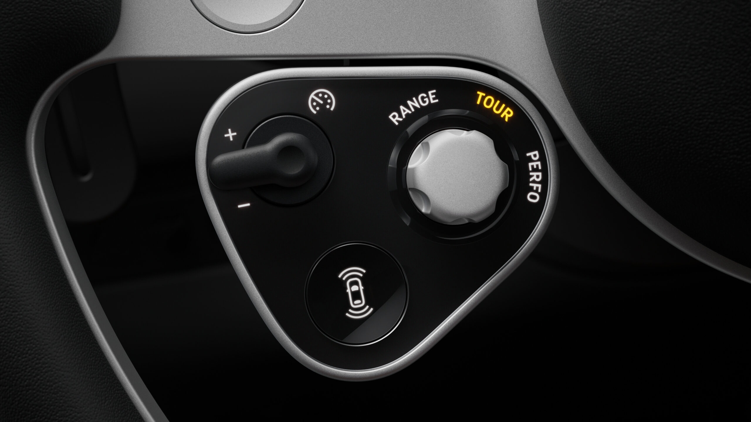 Hinter dem Dreispeichen-Lenkrad in Aluminiumstruktur befinden sich Rundinstrumente im klassischen Stil, wobei zwei Bildschirme übereinander liegen, um einen Eindruck einer Vertiefung im Kombiinstrument zu schaffen. Ein Highlight ist, dass sich das Kombiinstrument bewegt beim Lenken. Das Lenkrad hat rechts und links jeweils ein Bedienfeld mit physischen Tasten für die Einstellungen wie Fahrmodus, Scheibenwischer oder Anpassung an den Fahrbahnuntergrund: