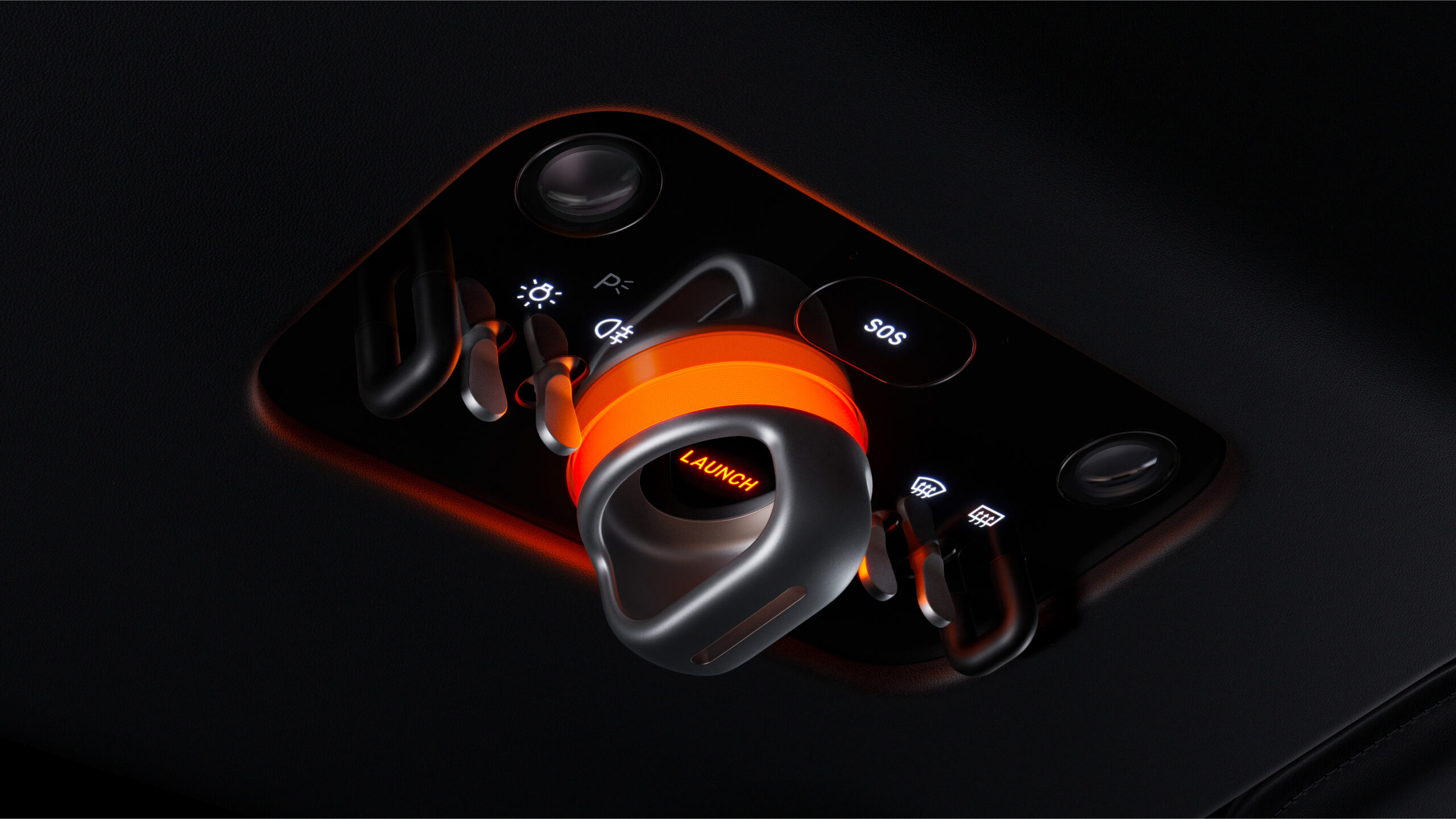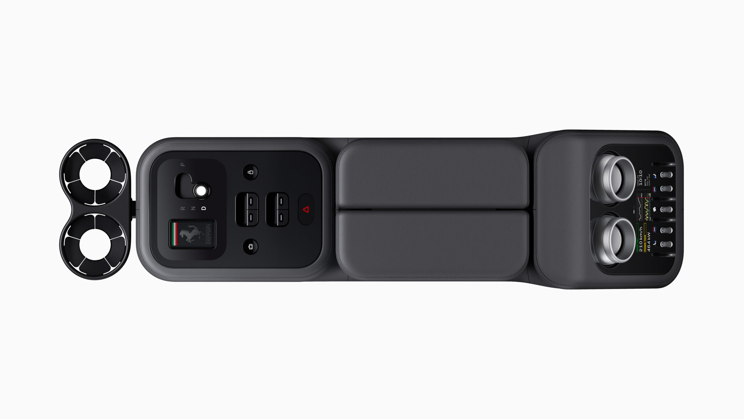 Im Zentrum findet man ein kugelgelagertes Bedienfeld, welches zum Fahrer oder Beifahrer ausgerichtet werden kann und vier Modi bietet: Uhr, Chronograph, Kompass und Launch Control. Eine darunterliegende Handballenauflage vereinfacht die Bedienung und die physischen Schalter steuern Klimaanlage und Sitzheizung.
