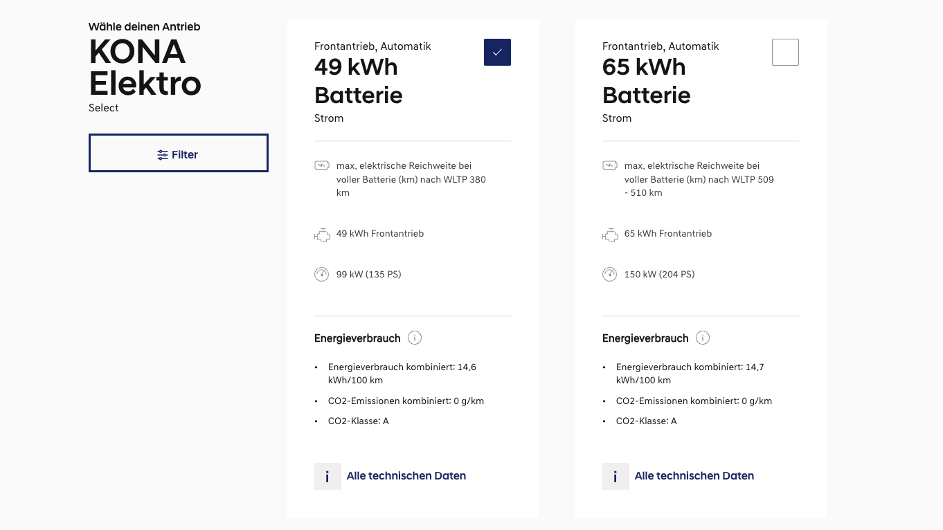 Wie man dem Konfigurator des Hyundai KONA Elektro entnehmen kann, ist das Elektro-SUV weiterhin in zwei Antriebs- und Batterieoptionen erhältlich, kommt aber künftig mit weniger Leistung. Beim KONA Elektro mit kleiner Batterie wurde die Leistung auf 99 kW (135 PS) reduziert und bei der Variante mit großer Batterie sind es 150 kW (204 PS). Zum Vergleich: Beim Vorgänger waren es 115 kW (156 PS) beziehungsweise 160 kW (218 PS).