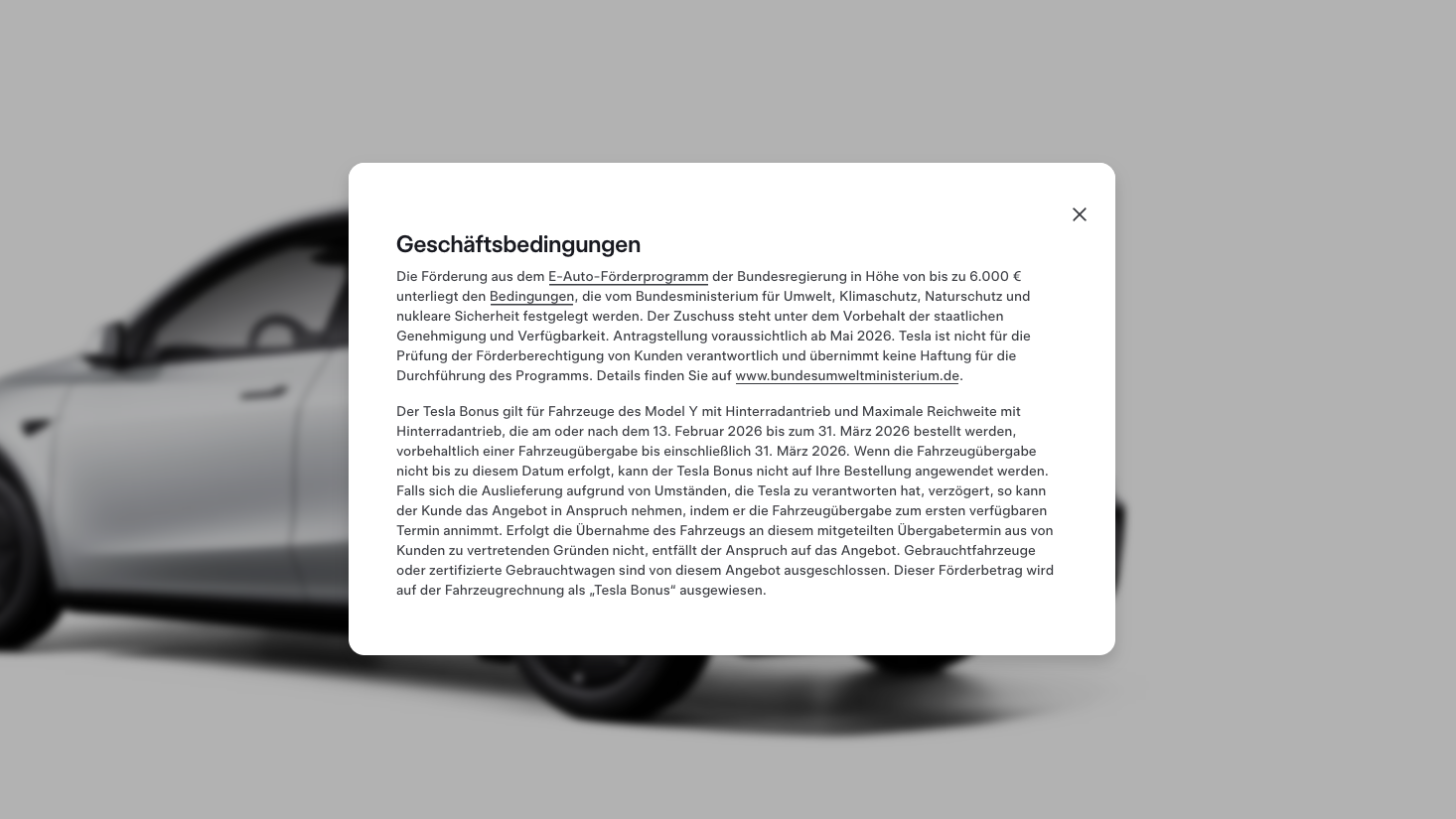 Hat man Anspruch auf die maximale Förderung von 6.000 Euro und zieht den Tesla-Bonus von 3.000 Euro vom Listenpreis ab, ist das Model Y RWD bereits ab 30.990 Euro erhältlich. Das Model Y RWD Long Range wäre ab 37.990 Euro zu haben, sofern man für die maximale Förderung berechtigt ist. Aber auch ohne staatliche Förderung können Kunden vom 3.000 Euro Tesla-Bonus profitieren, welcher bis zum 31. März 2026 beim Kauf, Finanzierung oder Leasing gilt: