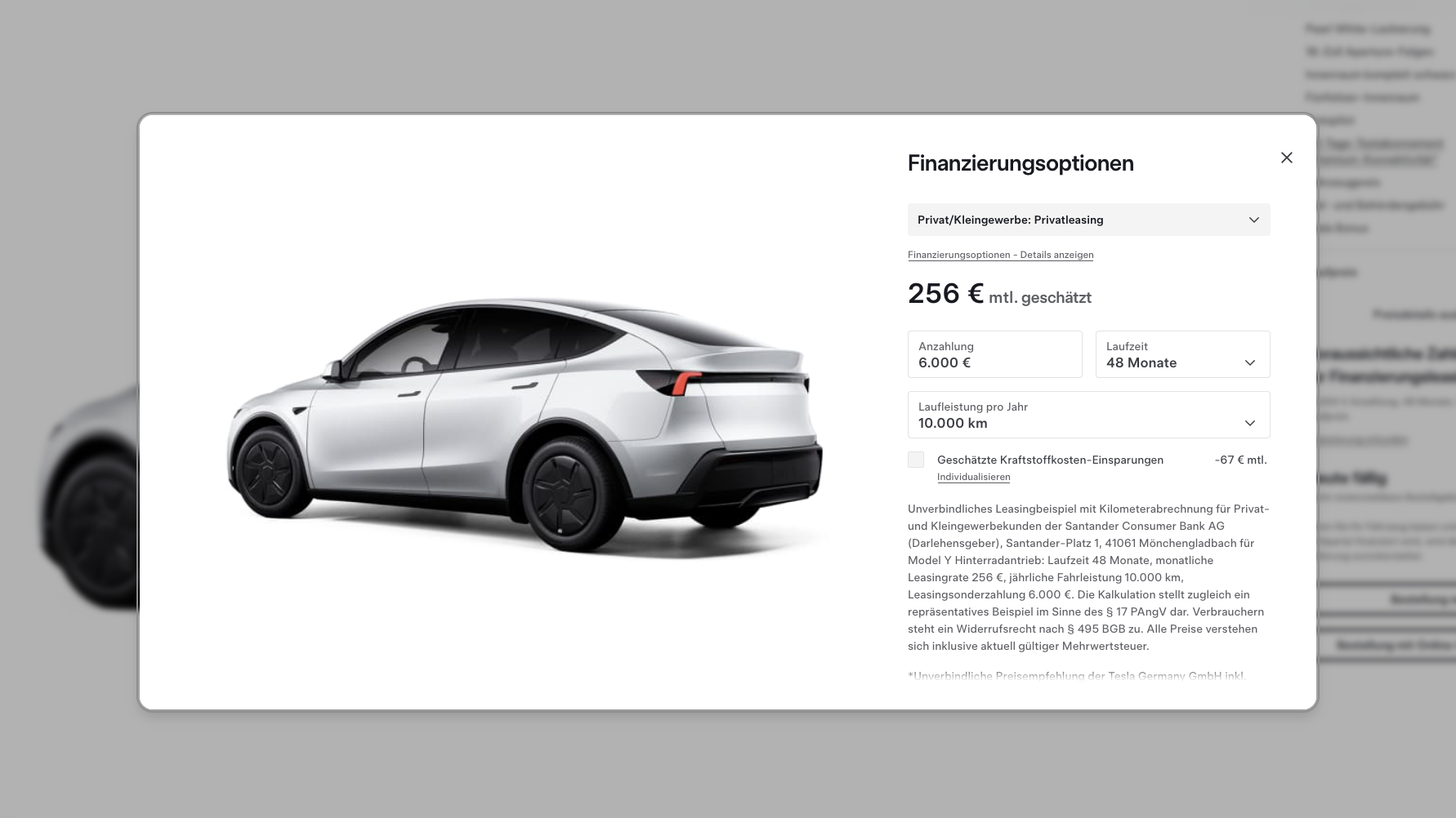 In Kombination mit dem Bonus und unabhängig von der staatlichen Förderung bietet Tesla eine Null-Prozent-Finanzierung auf die beiden „Standard-Versionen“ an. Beim Leasing über 48 Monate Laufzeit und einer jährlichen Laufleistung von 10.000 Kilometern ohne Anzahlung liegen die Leasing-Raten bei 399 Euro für das Model Y RWD und bei 499 Euro für die Long-Range-Variante. Als Beispiel: Nutzt man die maximale Förderung von 6.000 Euro als Anzahlung, reduzieren sich die Leasing-Raten auf 256 Euro beziehungsweise 357 Euro pro Monat:
